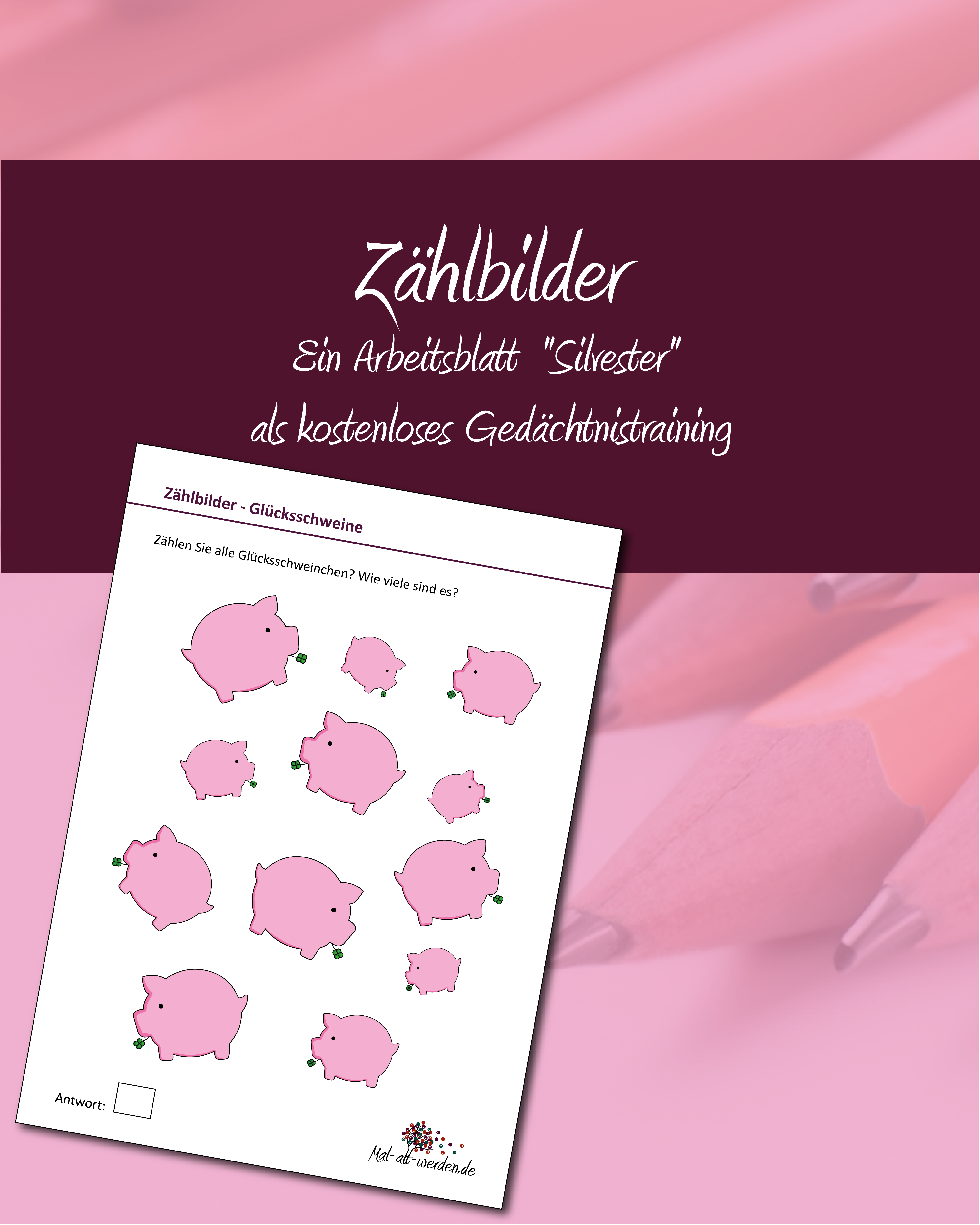 Dieses fröhliche Arbeitsblatt bringt sofort Silvesterstimmung in Ihre Runde. Auf dem Bild tummeln sich viele rosa Glücksschweinchen, einige groß, andere ganz klein. Alle tragen ein Kleeblatt im Maul und wirken, als würden sie fröhlich...