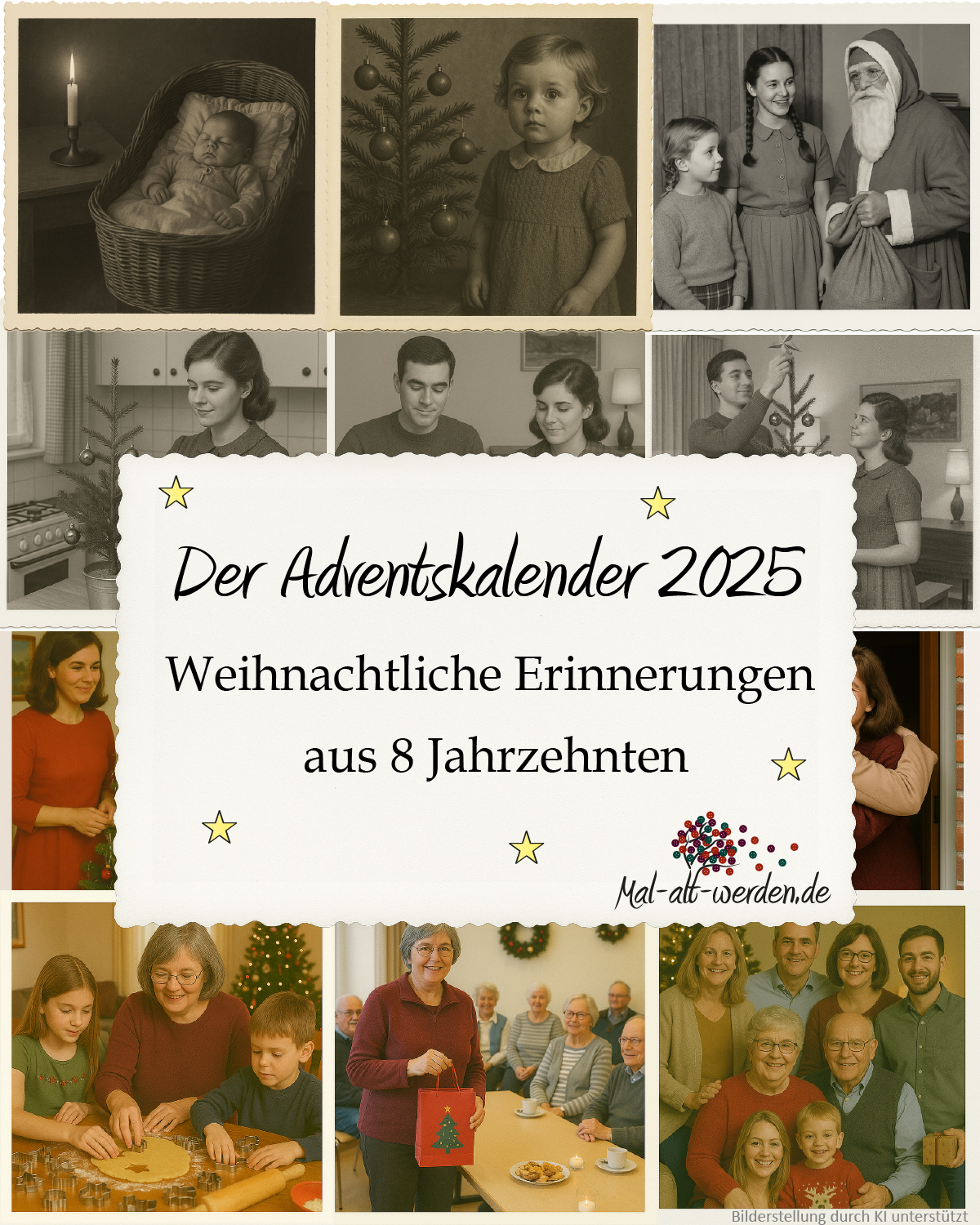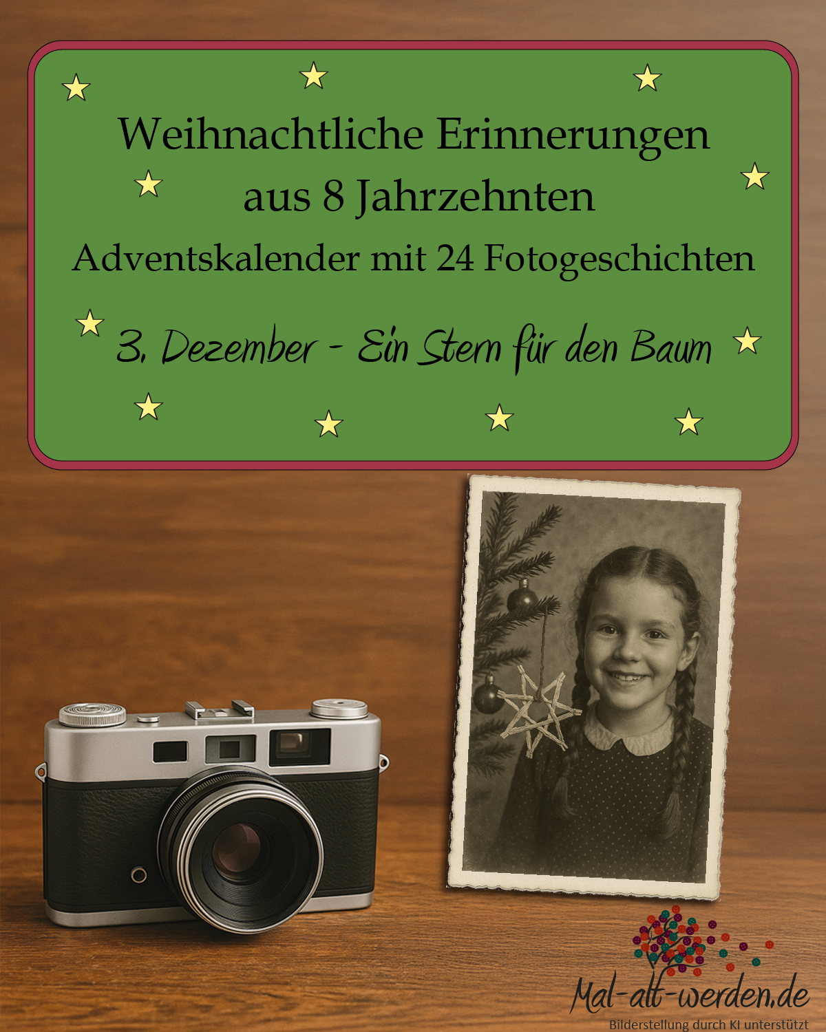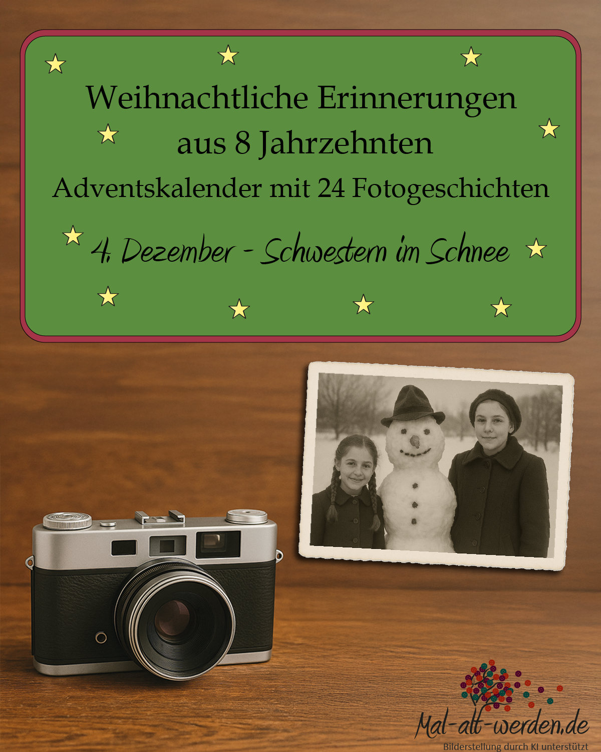 Auch in diesem Jahr haben wir auf Mal-alt-werden.de wieder einen besonderen Adventskalender vorbereitet.Unser Adventskalender 2025 trägt den Titel “Fotogeschichten aus acht Jahrzehnten”. Im Mittelpunkt steht Edith. Sie hat ein Fotoalbum geschenkt bekommen, gefüllt mit...