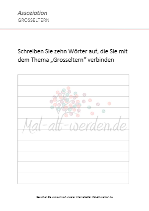 Nennen Sie als erstes den Begriff Großeltern und bitten Sie die Teilnehmenden, eine Assoziationskette zu bilden. Der erste Teilnehmende assoziiert einen zweiten Begriff zu Großeltern. Der dritte Teilnehmer assoziiert einen Begriff zu dem zweiten Begriff und so weiter. Auch bei dieser Übung gibt es keine falschen Assoziationen.