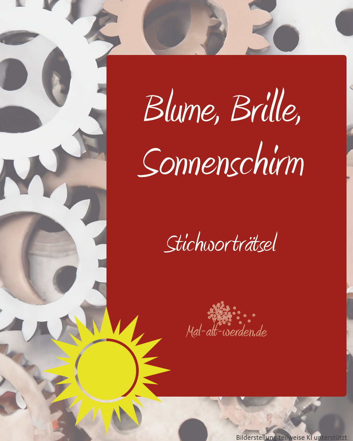 Blume, Brille, Sonnenschirm. Bezugswort gesucht! Ein Stichworträtsel für das Gedächtnistraining zu dem Thema Sonne