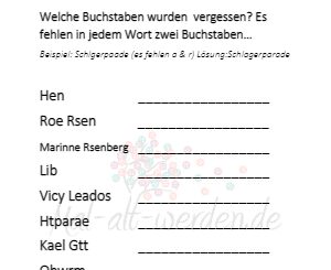 Auf dem Übungsblatt, das wir heute für Sie überarbeitet und neu aufgelegt haben, finden Sie Buchstabensalate zu dem Thema Oktoberfest. Die acht Begriffe rund um das Oktoberfest wurden kräftig durcheinandergebracht. Kein Buchstabe ist mehr an seinem eigentlichen Bestimmungsort. Wer kann die Buchstabensalate entschlüsseln? Ihre Teilnehmer im Gedächtnistraining vielleicht? Verteilen Sie die Arbeitsblätter, sorgen Sie dafür, dass jeder Teilnehmer einen Stift hat und finden Sie es heraus…