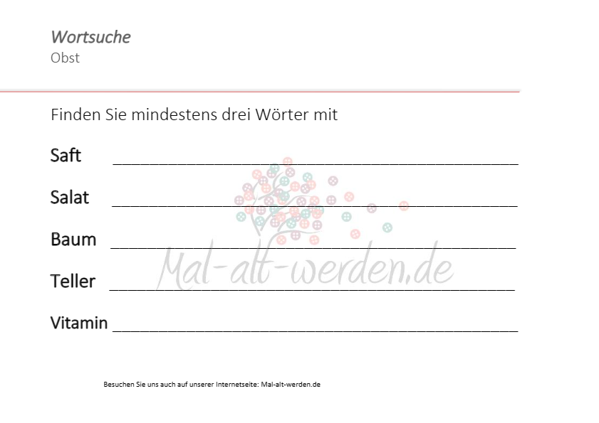 Obst ist doch was Feines! Es gibt so viele verschiedene Sorten und alle sind süß, erfrischend und gesund! Zum Thema Obst haben wir heute ein Arbeitsblatt “Wortsuche” als Gedächtnisübung für die Senioren vorbereitet.