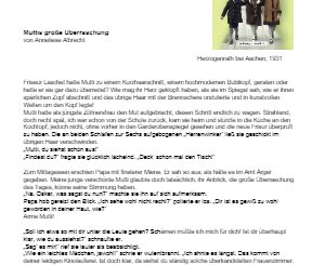Die Geschichte darf in Schriftform NICHT auf anderen Internetseiten verbreitet werden. Eine Ausnahme bilden Heimzeitungen von Seniorenheimen, die auf der Seite der Pflegeeinrichtung als PDF-Datei zur Verfügung stehen. Selbstverständlich freuen wir uns immer über einen Link. Das Verschicken per E-Mail ist unter den genannten Bedingungen möglich.