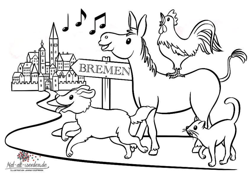 Das Märchen “Die Bremer Stadtmusikanten” als Malvorlage