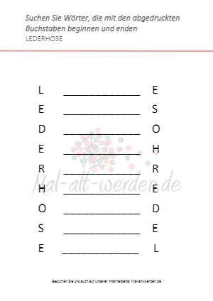 Die gefüllte Kalbsbrust ist eine Übung für fittere Senioren und geübte Gruppen. Das Wort, in diesem Fall “LEDERHOSE” wird senkrecht auf ein großes Stück Papier, eine Tafel oder das Flip-Chart geschrieben. Dann wird das Wort mit etwas Abstand noch einmal aufgeschrieben, nun aber rückwärts. Achten Sie darauf, dass sich die jeweiligen Buchstaben gegenüberstehen. Die Aufgabe der Senioren bei diesem Gedächtnistraining ist es nun, Wörter zu finden, die jeweils mit den vorgegebenen Buchstaben beginnen und enden. So entsteht eine gefüllte Kalbsbrust.