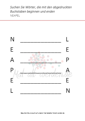 Das Arbeitsblatt “Gefüllte Kalbsbrust” ist ein kostenloses Gedächtnistraining für fitte Senioren und geübte Gruppen. Das Wort, in diesem Fall “NEAPEL”, wird senkrecht auf eine Tafel oder ein Flip-Chart geschrieben. Nach einem kurzen Abstand wird das Wort noch einmal rückwärts aufgeschrieben (ebenfalls senkrecht, so dass sich der erste und der letzte Buchstabe gegenüberstehen). Die Aufgabe der Mitmachenden ist es nun, Wörter zu finden, die zwischen die Buchstaben passen, die sich gegenüberstehen. Die Wörter müssen also mit dem ersten Buchstaben beginnen und mit dem zweiten enden.