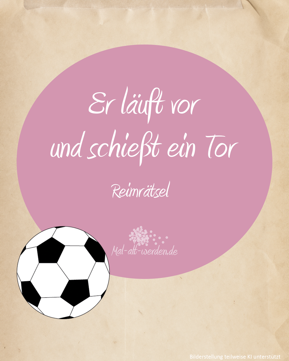 In diesem Reimrätsel drehen sich alle Reimwörter rund um das Thema Fußball. Das Reimrätsel kann beispielsweise ein Teil einer Gedächtnistrainingseinheit sein, ein selbst gemachtes Seniorenspiel ergänzen oder auch als Einstieg in biografische Gespräche genutzt werden.