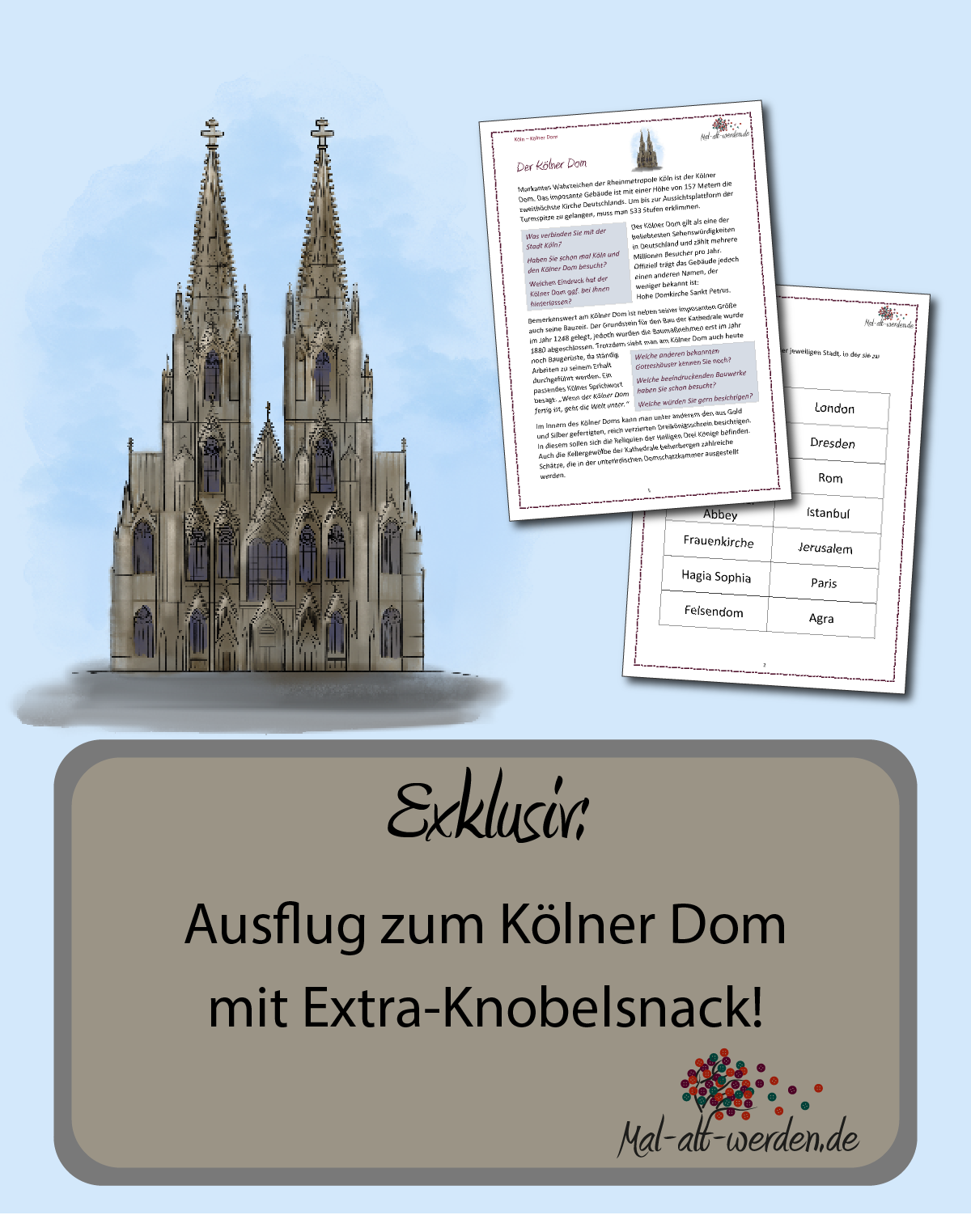 Diesmal geht unser Ausflug in die Stadt Köln und zu ihrem bekannten Wahrzeichen. Nehmen Sie die Senioren mit zum Kölner Dom und erfahren Sie, wer schon dort war. Wer von den Senioren kennt den offiziellen Namen des Kölner Doms? Hat vielleichte schon jemand den Turm bestiegen? Was verbinden die Senioren noch mit der Stadt Köln?
