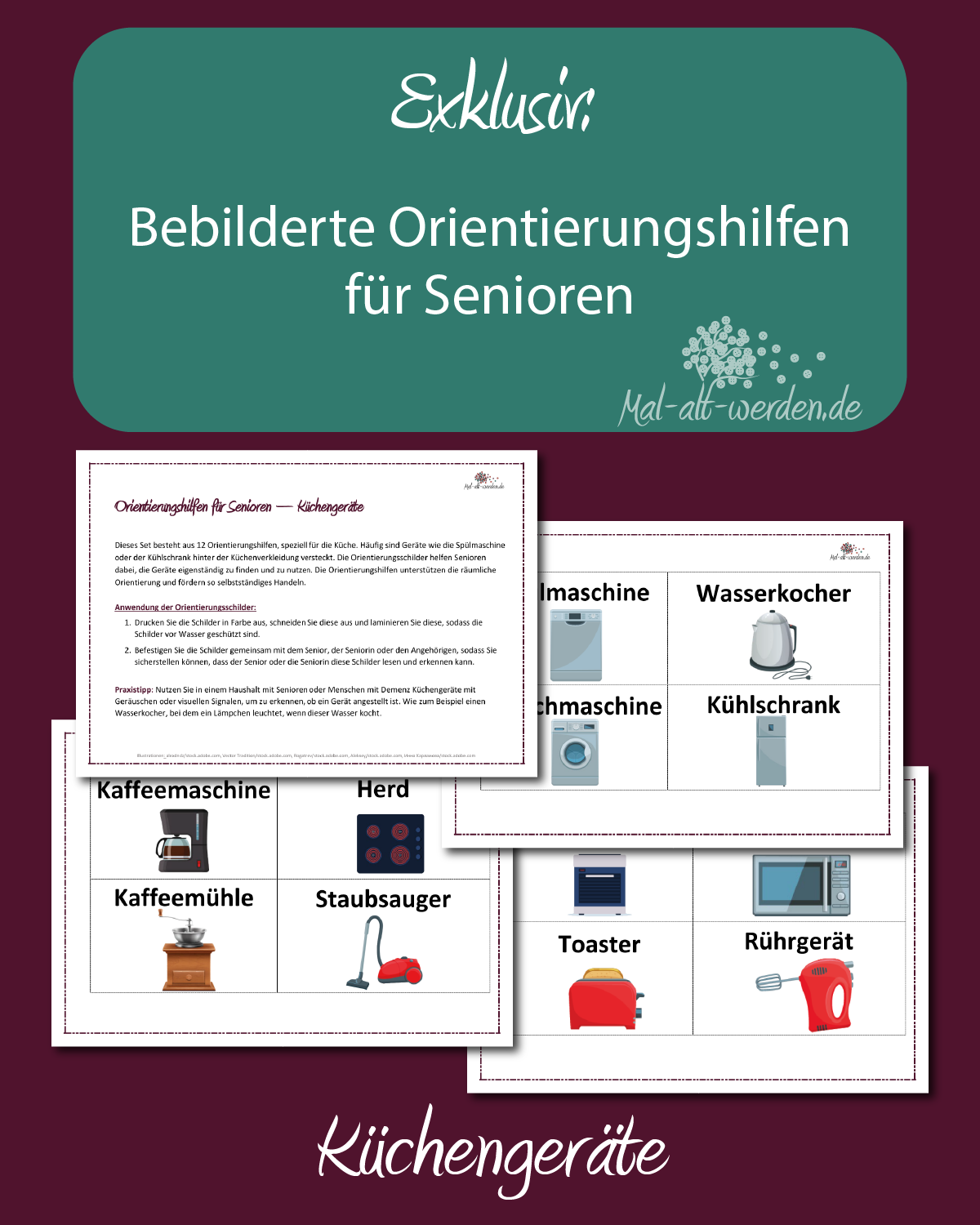 Bebilderte Orientierungshilfen für typische Küchengeräte zum Ausdrucken. Mit dem Orientierungshilfen-Paket für Senioren erhalten Sie 12 verschiedene bebilderte Orientierungshilfen mit typischen Küchengeräten eines Haushaltes. Die Orientierungshilfen sind für Senioren und Menschen mit Demenz entwickelt worden und enthalten ein Bild des Gegenstandes und den dazugehörigen Namen des Küchengerätes. Die Orientierungshilfen ermöglichen den Senioren ein selbstständiges Handeln im Alltag.