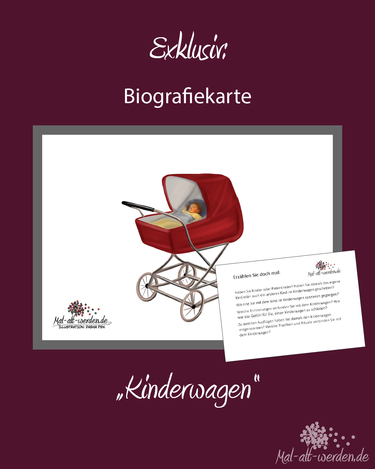 Welche Erinnerungen verbinden die Senioren mit dem Kinderwagen? Welche Ausflüge wurden mit dem Kinderwagen unternommen? Mit diesen und weiteren Fragen zum Thema Kinderwagen haben wir eine Biografiekarte mit Illustration für Sie gestaltet. Ermöglichen Sie den Senioren, sich an die eigene Kindheit zu erinnern oder an das Gefühl, einen Kinderwagen zu schieben. Bauen Sie auch Patenkinder oder weitere Kinder der Familie ein, da vielleicht nicht jeder Teilnehmende eigene Kinder hat. Nutzen Sie diese Biografiefragen für eine Gruppenstunde zum Thema oder nutzen Sie die Fragen für eine Kurzbegegnung mit den Senioren.