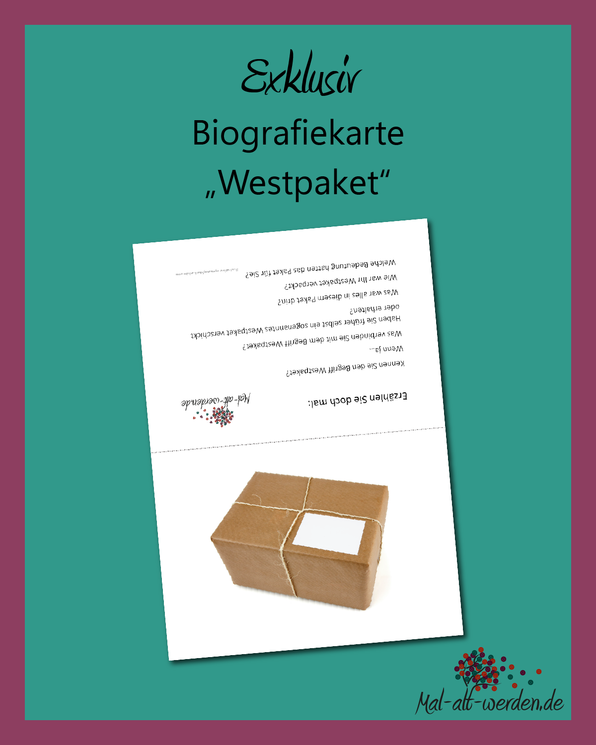 Nach dem Falten und Laminieren kann die Karte immer wieder genutzt werden. Die Rückseite lädt dazu ein, ins Gespräch zu kommen. Unter der Überschrift “Erzählen Sie doch mal” sind unterschiedliche Fragen zu finden. Die Fragen regen dazu an, über die Bedeutung solcher Pakete und die eigenen Erinnerungen zu sprechen.
