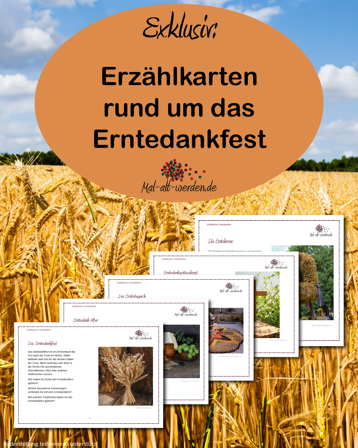 Jede Erzählkarte enthält ein großes Bild mit einem kurzen Einführungstext und einige Fragen rund um das Thema Erntedankfest. Die Fragen unterstützen Sie beim Einstieg in ein Gespräch über das Erntedankfest. Geben Sie den Senioren die Möglichkeit, von ihren eigenen Erfahrungen, Erinnerungen und Eindrücken rund um das Erntedankfest zu berichten. Nutzen Sie die Erzählkarten im Rahmen einer Einzelbegegnung oder als Teil eines Gruppenangebotes mit den Senioren. Verwenden Sie ebenfalls die Bilder der verschiedenen Erzählkarten. Zeigen Sie die Bilder den Senioren, denn oft werden Erinnerungen durch das Anschauen von Bildern gefördert. Sie können auch verschiedene Gegenstände passend zum Thema Erntedankfest mitbringen, um die Runde komplett zu machen.