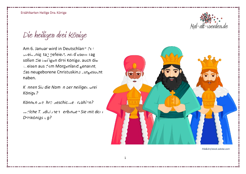 Die heiligen drei Könige sind diesmal Thema unseres Erzählkartenpakets. Welche Bedeutung hat dieser Feiertag für die Senioren? Wer kennt die Geschichte der heiligen drei Könige? Welche Traditionen gibt es an diesem Feiertag? Kommen Sie durch die Erzählkarten mit den Senioren ins Gespräch und finden es heraus. Jede Karte enthält eine große Abbildung, einen kurzen Einführungstext und Fragen, die den Einstieg ins Gespräch erleichtern. Nutzen Sie die Erzählkarten als Gesprächsanregung und lassen Sie sich von den Erzählungen der Senioren leiten. Ist ein Teil des Themas erschöpft, können Sie das Gespräch mit der nächsten Karte erneut anregen.