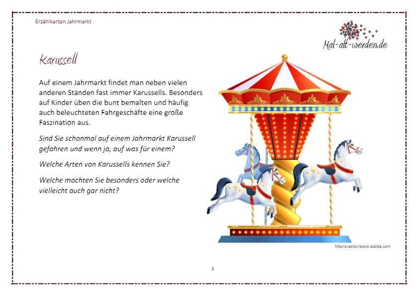 Das Thema unserer Erzählkarten dreht sich diesmal rund um den Jahrmarkt. Unser neues Erzählkartenpaket enthält zahlreiche Anregungen, die Sie dabei unterstützen mit den Senioren ins Gespräch zu kommen. Jede der groß bebilderten Erzählkarten enthält eine kurze Einführung und Fragen zum Thema. Beim Jahrmarkt sind unterschiedlichste Karten, vom Karussell bis zur Zuckerwatte, mit dabei. Nehmen Sie sich für jede einzelne Karte Zeit und lassen Sie sich von den Erzählungen der Senioren leiten. Ist ein Thema erschöpft, hilft die nächste Erzählkarte dabei, das Gespräch wieder aufleben zu lassen.