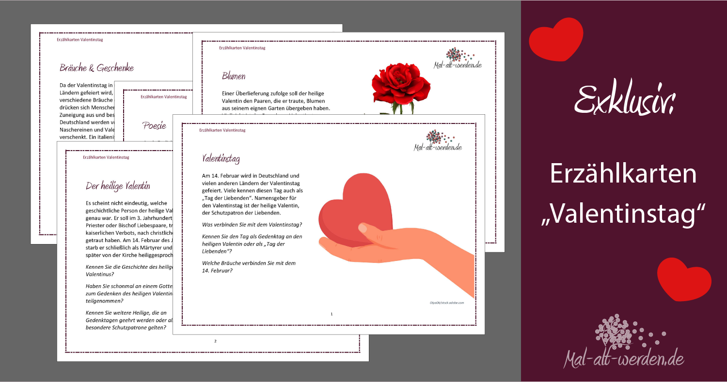 In diesem Erzählkartenset dreht sich alles um den Valentinstag, seinen Ursprung und natürlich die Liebe. Nutzen Sie die Erzählkarten, um mit den Senioren ins Gespräch zu kommen. Woher hat der Valentinstag eigentlich seinen Namen? Wer kennt ihn als “Tag der Liebenden”? Wer hat schonmal einen Liebesbrief erhalten oder sogar verfasst? Erzählen und erinnern Sie sich gemeinsam mit den Senioren. Die kurzen Erläuterungen und passenden Fragen auf den Erzählkarten dienen dabei als Anregung. In einer gemütlichen Runde wissen die Senioren bestimmt viele Geschichten rund um den Valentinstag und die Liebe zu erzählen.