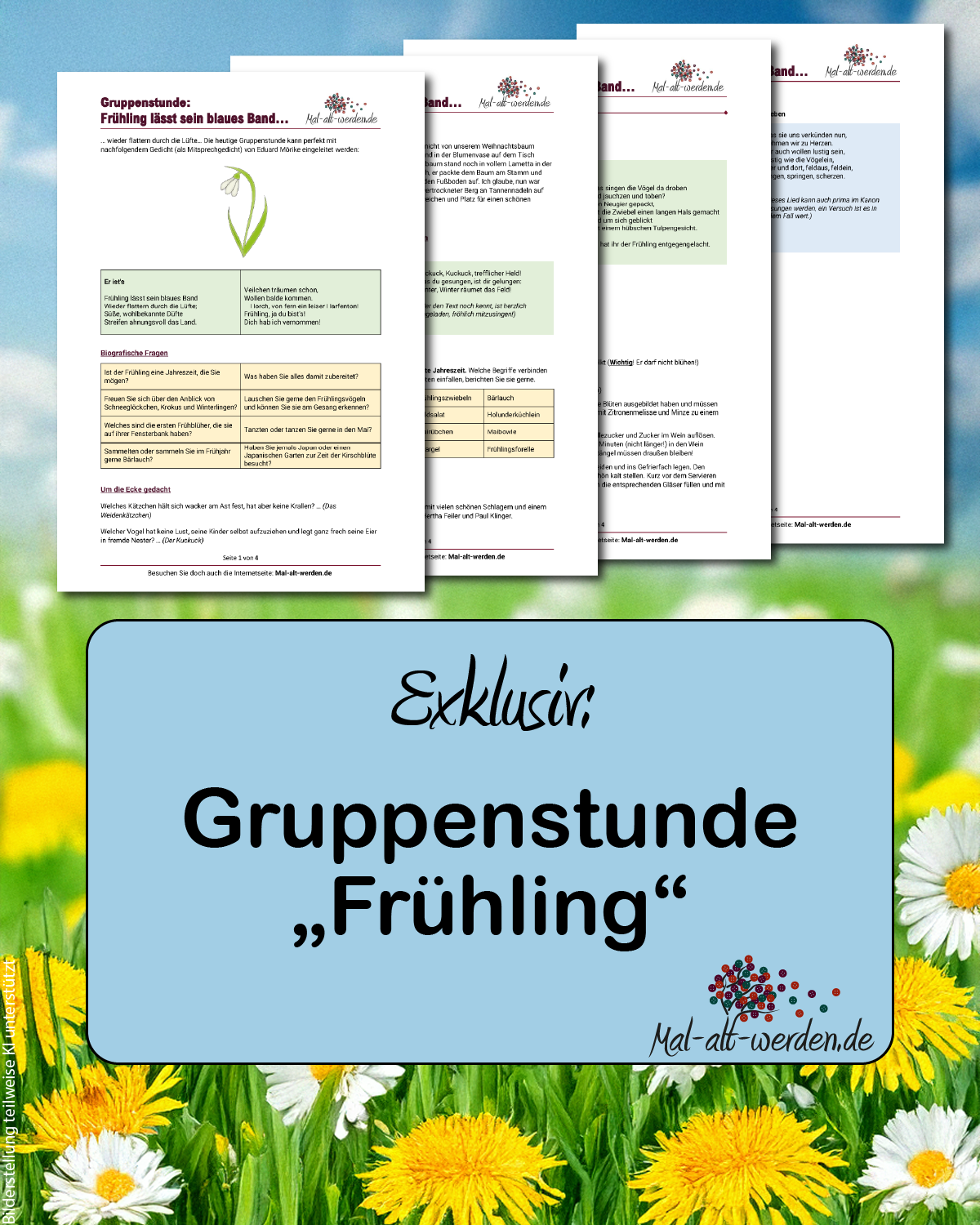 “Frühling lässt sein blaues Band…” – Die meisten von Ihnen können das Gedicht wahrscheinlich auswendig mitsprechen. Oder mindestens die nächste Zeile weitersprechen. Das Gedicht von Eduard Mörike gehört wahrscheinlich zu den bekanntesten Frühlingsgedichten, mit dem schon Generationen den Frühling eingeläutet haben. Unsere Gruppenstunde beginnt genau mit diesem Frühlingsgedicht und bietet den optimalen Einstieg in frühlingshafte Stimmungen.