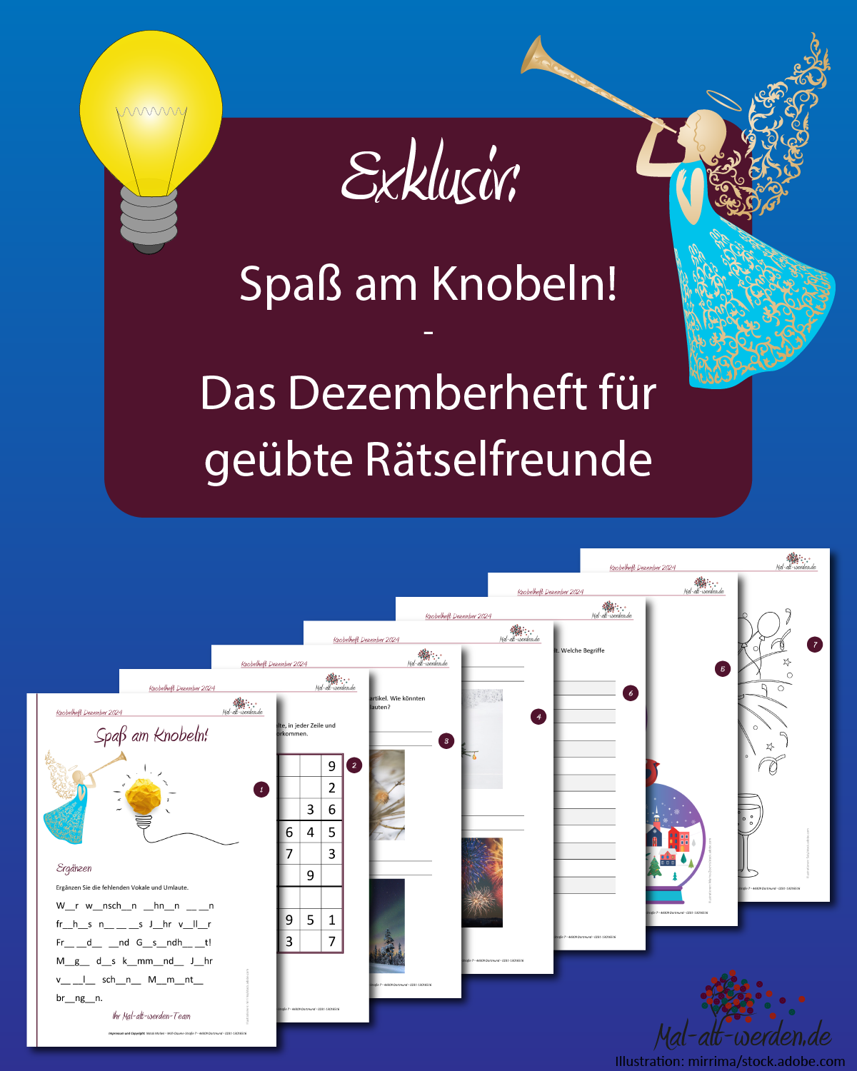 Wir laden alle Abonnenten unseres Exklusiv-Bereichs herzlich dazu ein, sich das Heft herunterzuladen und es den Senioren zur Verfügung zu stellen. Diese können die Rätsel eigenständig lösen oder sie nutzen die Aufgaben, um gemeinsam in Gruppen zu knobeln. Die einzelnen Seiten können wunderbar für Gedächtnistrainingsstunden oder Rätselrunden verwendet werden. Das Heft bietet viele abwechslungsreiche Übungen, um die Advents- und Jahreswechselzeit unterhaltsam und geistig anregend zu gestalten.