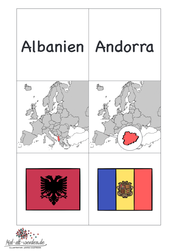 Zusätzlich zu unserem klassischen Format für Zuordnungsspiele, haben wir Dateien für Sie bereitgestellt, auf denen die Länder Europas, die Nationalflaggen und die Ländernamen jeweils ganzseitig dargestellt sind. In diesem großen Format lassen sich die Karten ideal in der Gruppe nutzen.