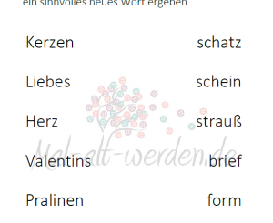 Eine schöne Übung für das Gedächtnistraining mit Senioren ist das Suchen von “Mittelwörtern”. Das heisst, dass zwei Wörter vorgegeben werden und ein verbindendes Wort gefunden werden soll. Das gefundene Wort soll mit den beiden anderen Wörter ein SINNVOLLES zusammengesetztes Wort ergeben. Für die Übung können die zwei vorgegebenen Wörter jeweils auf das Flip-Chart geschrieben werden.