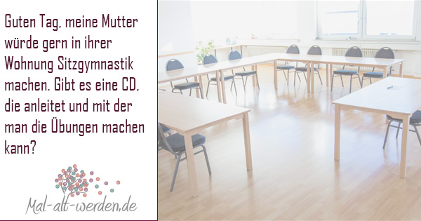 Guten Tag, meine Mutter würde gern in ihrer Wohnung Sitzgymnastik machen. Gibt es eine CD, die anleitet und mit der man die Übungen machen kann? Würde mich freuen, wenn Sie mir weiterhelfen könnten. Danke und viele Grüße.