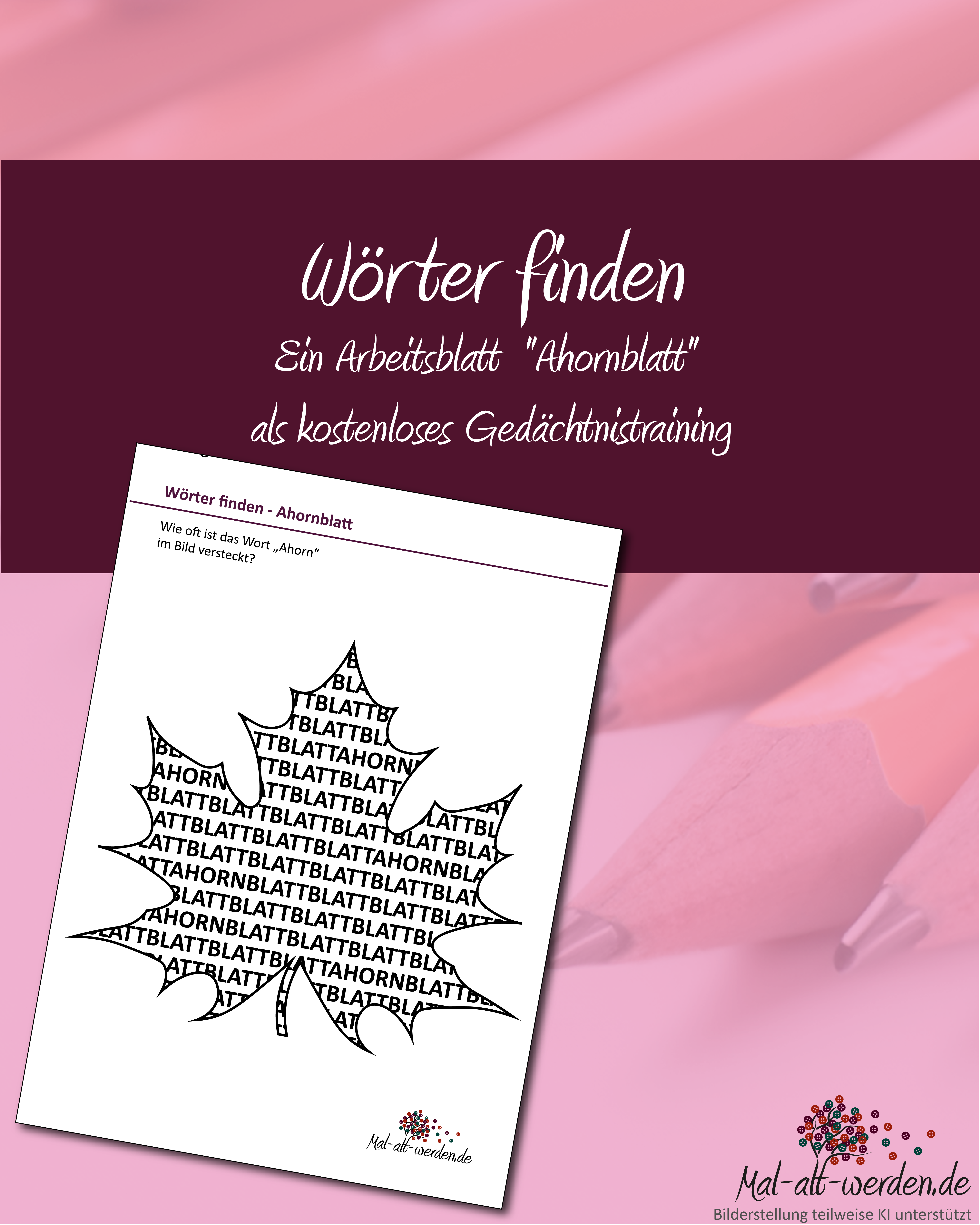In den Umrissen eines Ahornblatts steht immer wieder das Wort „Blatt“. Doch zwischen den Zeilen hat sich auch das Wort „Ahorn“ versteckt. Die Herausforderung: Alle „Ahorn“-Wörter ausfindig machen, umkreisen und zählen.