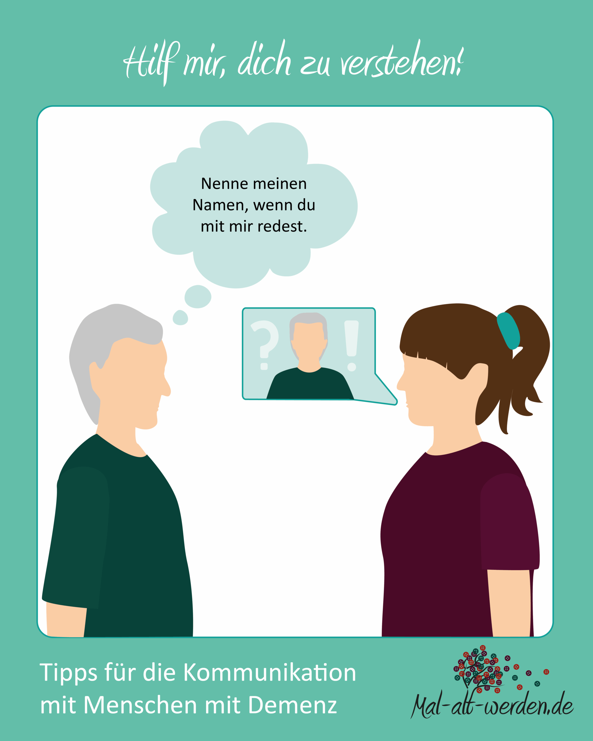 Das Bild zeigt eine betreuende Person und einen Menschen mit Demenz. In der Gedankenblase steht: „Nenne meinen Namen, wenn du mit mir redest.“ Die Illustration macht deutlich, wie leicht Missverständnisse entstehen können. Gerade in einer Umgebung, in der mehrere Personen sprechen oder Hintergrundgeräusche stören, ist nicht immer klar, an wen sich eine Aussage richtet.