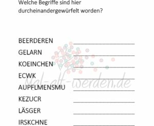Eine schöne Übung für das Gedächtnistraining mit Senioren ist das Suchen von “Mittelwörtern”. Das heisst, dass zwei Wörter vorgegeben werden und ein verbindendes Wort gefunden werden soll. Das gefundene Wort soll mit den beiden anderen Wörter ein SINNVOLLES zusammengesetztes Wort ergeben. Für die Übung können die zwei vorgegebenen Wörter jeweils auf ein Flip-Chart geschrieben werden.