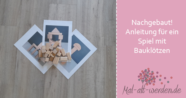 Zunächst wird selbst eine Vorlage erstellt. Dazu muss das Gebäude mit Hilfe der vorhandenen Bauklötze einmal aufgebaut und anschließend abfotografiert werden. Danach wird das Bild ausgedruckt und idealerweise laminiert, um eine häufige Wiederverwendbarkeit zu ermöglichen. Nun kann das Gebäude unter Zuhilfenahme der Vorlage von den Senioren nachgebaut werden. Eine Variante ist zum Beispiel, sich das Bild anzuschauen, umzudrehen und dann das Gebäude aus dem Gedächtnis zusammenzubauen.