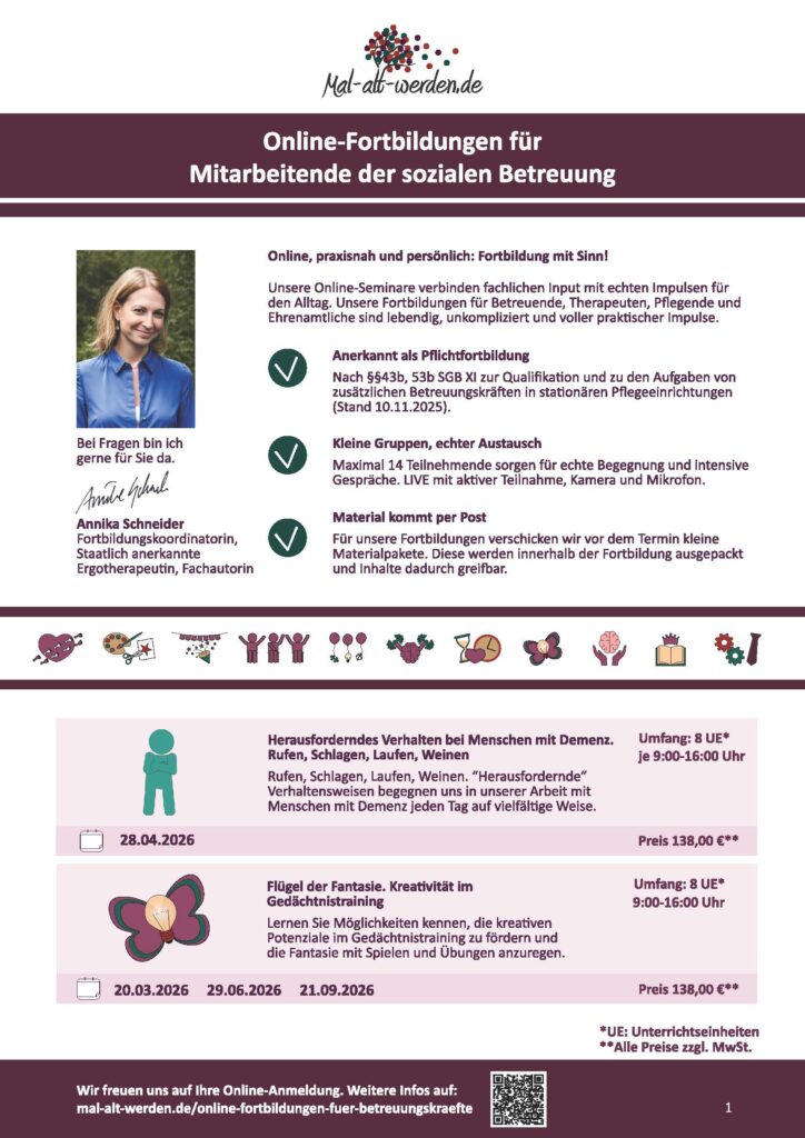 Knappe Zeit mit großem Wert! Online-Fortbildung für Mitarbeitende der sozialen Betreuung in der Altenpflege. Die Fortbildung beinhaltet die Reflexion der beruflichen…