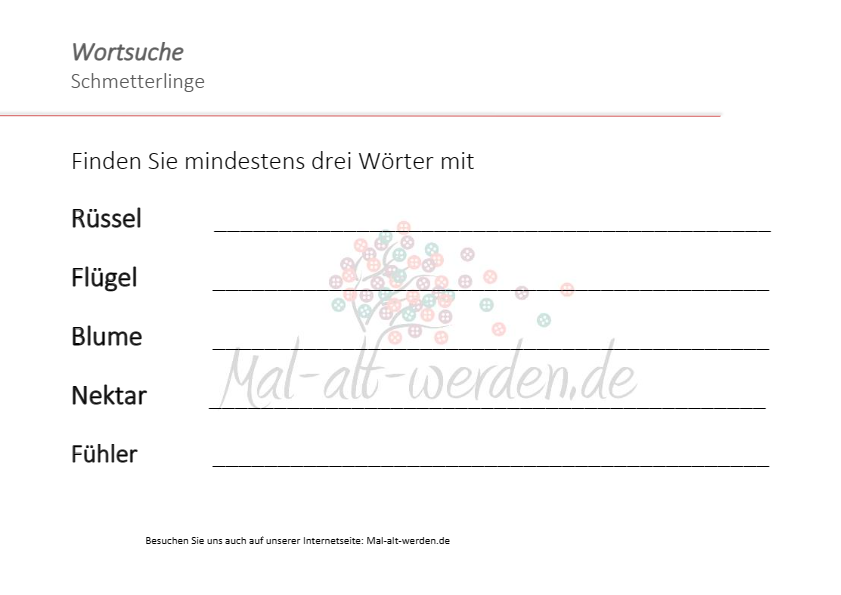Auf dem Arbeitsblatt stehen fünf Begriffe, die sich rund um das Thema Schmetterlinge drehen. Die Aufgabe der Mitmachenden ist es nun, mindestens drei Wörter zu finden, die sich mit den jeweiligen Begriffen zusammensetzen lassen. Die neuen Wörter werden dann auf das Arbeitsblatt geschrieben – die Linien wirken dabei unterstützend. Nach Beendigung des Gedächtnistrainings werden die Wortschöpfungen der Reihe nach vorgelesen.