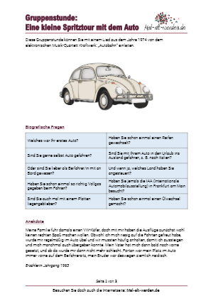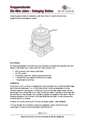 Eine heitere Gruppenstunde rund um die 60er Jahre! Tauchen Sie mit den Senioren in die Welt der 60er Jahre ein! Schwelgen Sie in Erinnerungen an Fernsehen, Filme, Musik und bekannte Persönlichkeiten aus den 1960er...