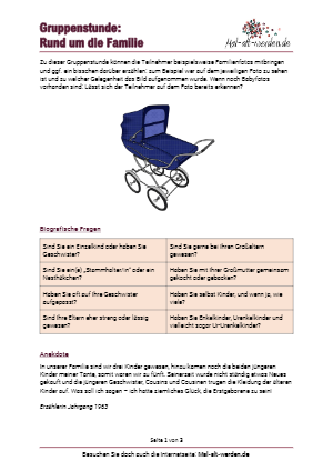 In dieser Gruppenstunde drehen sich alle Ideen und Anregungen rund um das Thema Familie. Neben einer kurzen Anekdote und passenden biografischen Fragen, die den Gesprächseinstieg erleichtern sollen, finden Sie darin kleine Rätsel, ein Fernsehquiz,...