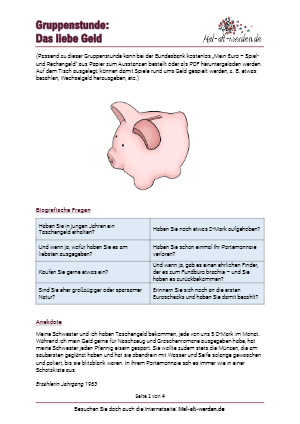 In dieser Gruppenstunde befassen wir uns mit dem Thema Geld. Sie beginnt mit einer kurzen Anekdote zum Thema Taschengeld und passenden Vorschlägen für biografische Fragen. Wenn Sie die Möglichkeit haben, bringen Sie gerne ein...