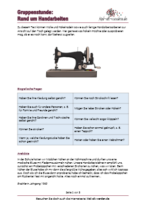 In dieser Gruppenstunde dreht sich alles rund um Garne, Wolle, Stoffe und vieles weitere, was die Senioren mit dem Thema Handarbeiten verbindet. Hier werden in den meisten Fällen die Senioren die Experten sein! Und...