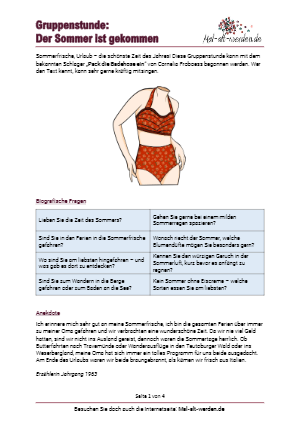 Unsere heutige Gruppenstunde dreht sich vollkommen um das wunderbare Thema Sommer. Kommen Sie mit auf eine sommerliche Reise und testen Sie sich durch verschiedene Obstsorten, singen Sie ein bekanntes Wanderlied, gestalten Sie sommerliche Gedächtnisübungen...