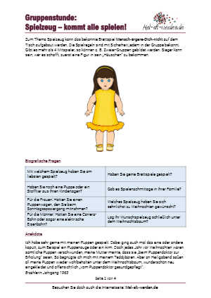 In unserer exklusiven Gruppenstunde zu dem Thema Spielzeug finden Sie viele Ideen für die Begleitung von Senioren rund um Puppen, Spielzeugautos, Brettspiele, Weihnachtswünsche, Teddybären, Rollschuhe, Ritterfiguren und vieles, vieles mehr. Die Gruppenstunde wurde für...