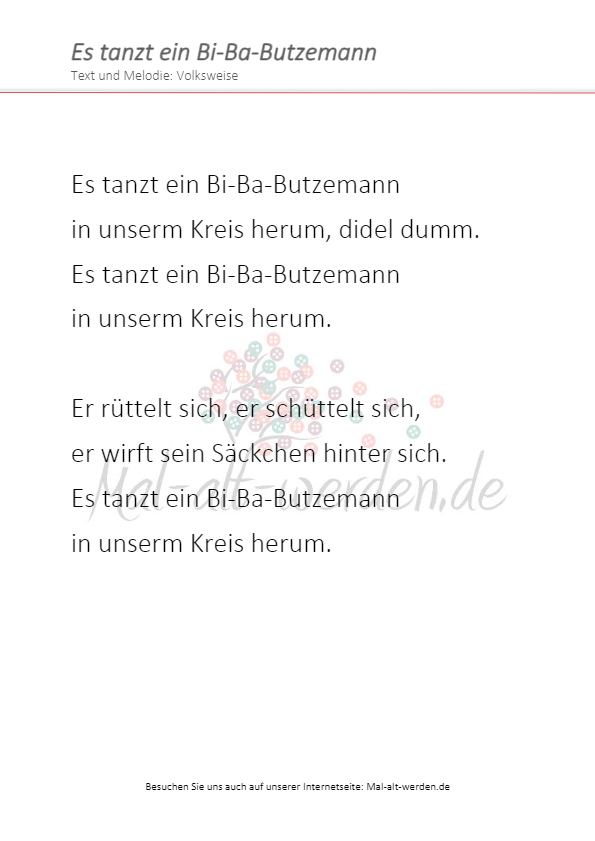 Auf Mal-alt-werden.de stellen wir Ihnen immer mal wieder bekannte Volkslieder für die Seniorenarbeit vor. In unserer Reihe “Kinderlieder für die Seniorenarbeit” beschäftigen wir uns heute mit dem Kinderlied “Es tanzt ein Bi-Ba-Butzemann”. Der Bi-Ba-Butzemann,...