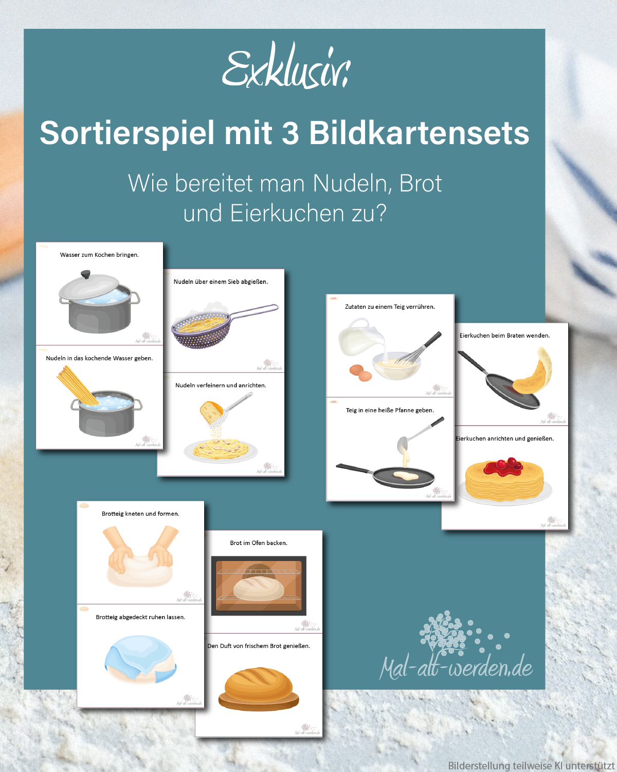 Exklusiv: Sortierspiel mit 3 Bildkartensets – Wie bereitet man Nudeln, Brot und Eierkuchen zu?
