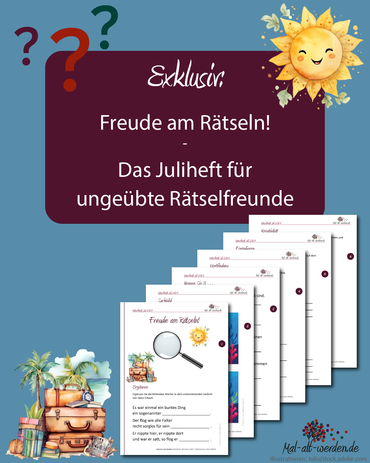 Ein sommerliches Rätselheft für ungeübte Senioren zum Herunterladen und Ausdrucken. Auf 6 Seiten finden ungeübte Senioren in unserem Rätselheft unterschiedliche Rätsel und Kreativaufgaben. Thematisch dreht sich in diesem Heft alles um den Sommermonat Juli....