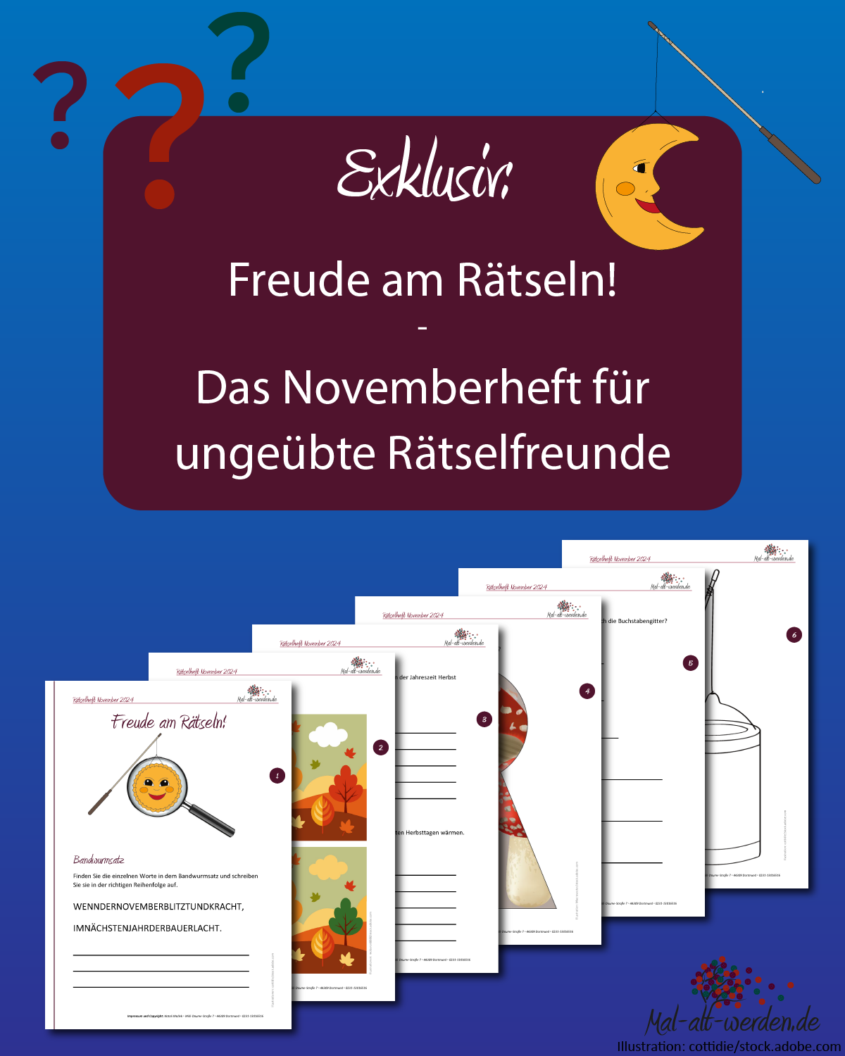 Unser Novemberheft für ungeübte Rätselfreunde wartet darauf, genutzt und ausgedruckt zu werden! Wir haben ein 8-seitiges Rätselheft rund um den November für Sie vorbereitet, das abwechslungsreiche und unterhaltsame Aufgaben enthält. So kann zum Beispiel...