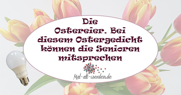 Ein heiteres Mitsprechgedicht rund um die Ostereier am Osterfest. Zum Vorlesen und Mitmachen! Die Ostereier. Bei diesem Ostergedicht können die Senioren mitsprechen Die Hasen haben viel zu tun Keine Zeit sich auszu… ruhn Eier...