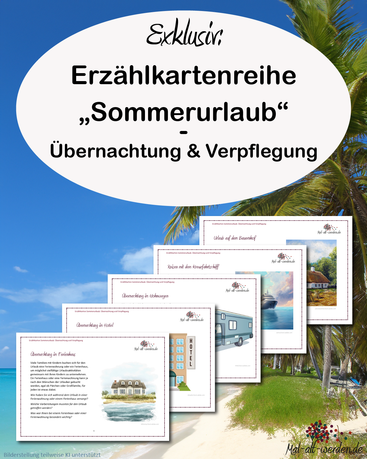 Erzählkarten zum Thema “Übernachtung und Verpflegung im Sommerurlaub”. Passend zur Urlaubszeit haben wir Ihnen eine kleine exklusive Erzählkartenreihe zum Thema Sommerurlaub erstellt. In diesem Erzählkartenpaket thematisieren wir die Übernachtung und Verpflegung während des Sommerurlaubs....