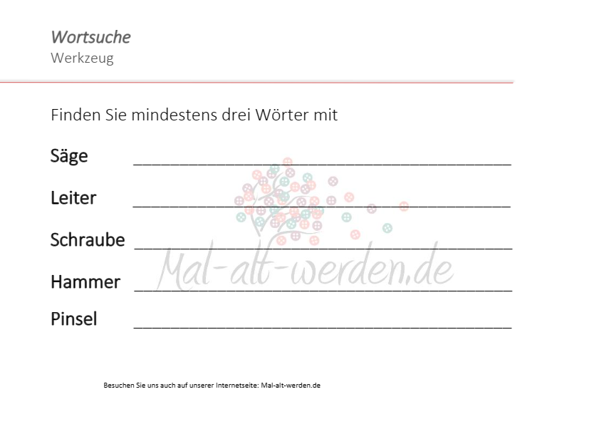 Auf dem Arbeitsblatt stehen fünf Begriffe, die sich rund um das Thema Werkzeug drehen. Die Aufgabe der Senioren ist es nun, mindestens drei Wörter zu finden, die sich mit den jeweiligen Begriffen zusammensetzen lassen. So entstehen neue, sinnvolle Wörter, die auf das Arbeitsblatt geschrieben und nach Beendigung des Gedächtnistrainings vorgelesen werden.