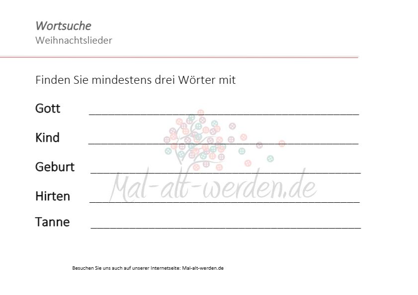 Heute haben wir für die Senioren eine Gedächtnisübung zu dem Thema Weihnachtslieder vorbereitet. Das Arbeitsblatt “Wortsuche” können Sie ganz einfach herunterladen und anschließend ausdrucken, indem Sie auf den PDF-Button klicken. Verteilen Sie an jeden Anwesenden ein Exemplar und legen Sie auch Stifte bereit.