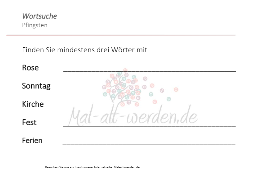 Wir haben heute für die Senioren ein kostenloses Arbeitsblatt “Wortsuche” zum Thema Pfingsten eingestellt.