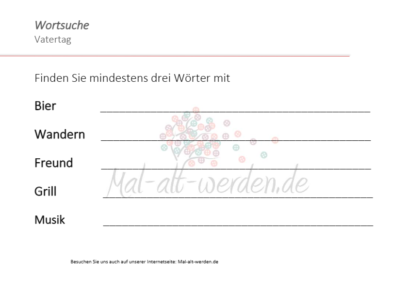 Auf dem Arbeitsblatt stehen fünf Begriffe, die sich rund um das Thema Vatertag drehen. Die Aufgabe der Teilnehmenden ist es nun, mindestens drei Wörter zu finden, die sich mit den jeweiligen Begriffen zusammensetzen lassen. So entstehen neue, sinnvolle Wörter, die auf das Arbeitsblatt geschrieben und nach Beendigung des Gedächtnistrainings vorgelesen werden.
